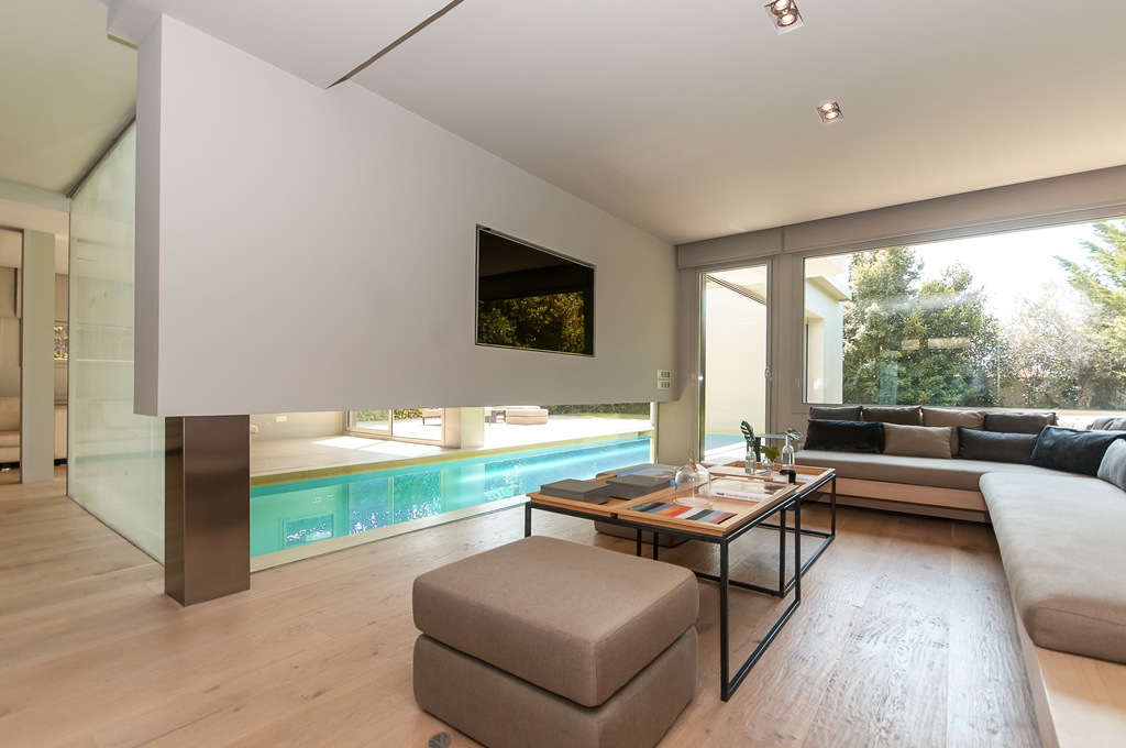 Modern residence that stands out for its architecture and design, made by F. Oliva y Susana G. Hoffmann. Located in premium residential area, 10 minutes from Barcelona. Its 724sqm are organized around a modern pool that partially enters the wide open spaces hosting the living room and the kitchen. This unique attraction is enjoyed from the 3 floors of the property.