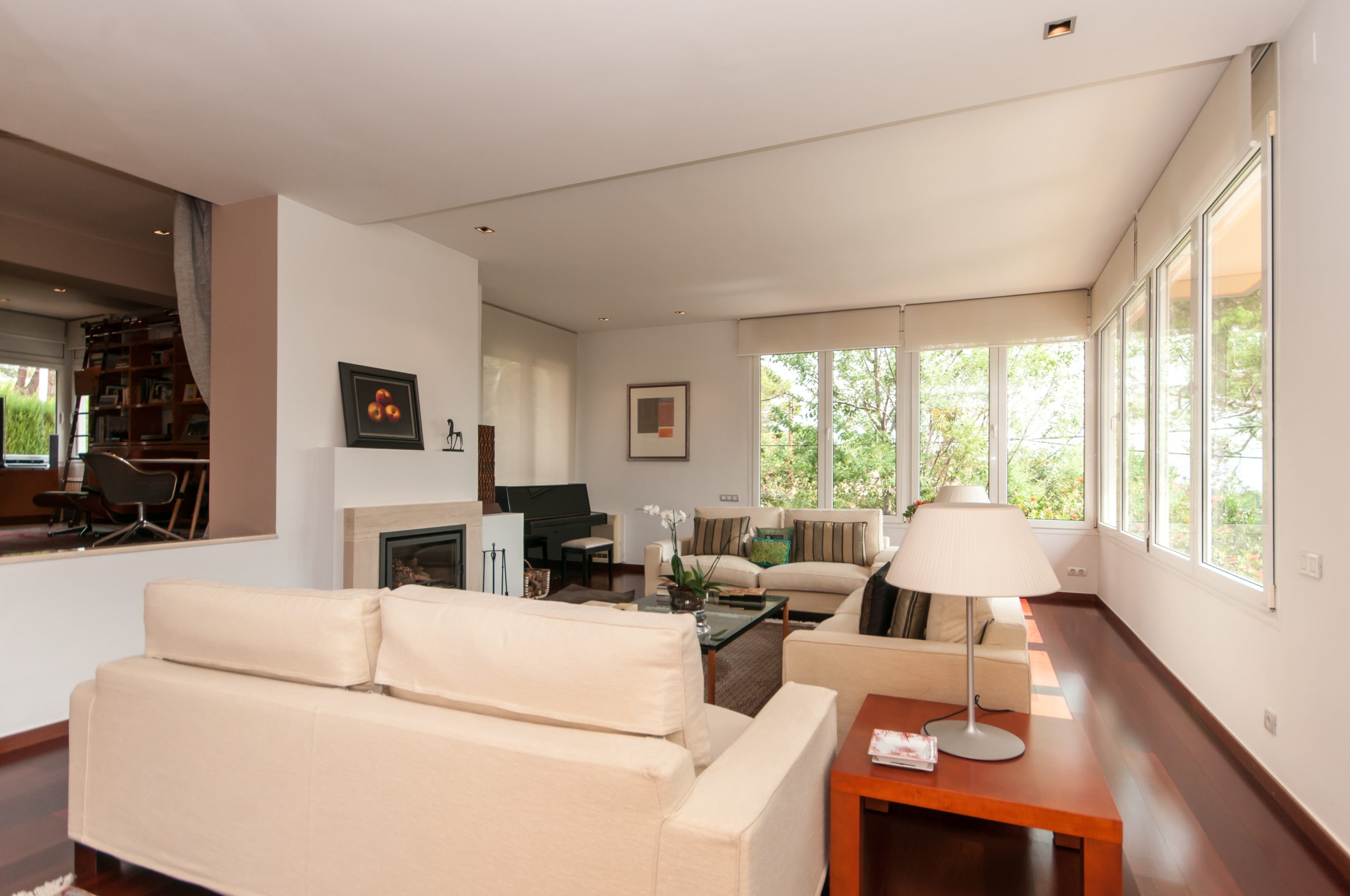 On the first floor stands the large living room, divided into three levels, with terrace; a spacious kitchen and a room for service. On the ground floor there are 2 suites also with terrace and a large dressing room, two double bedrooms sharing a full bathroom, and an elegant office with fireplace. In the semi-basement floor we find a beautiful cellar, a gym room and a multipurpose room with access to the garden.