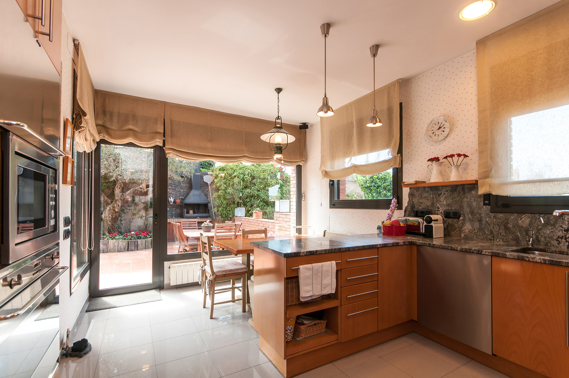 The house is distributed into 3 floors. On the ground floor there is a living-dining room with exit to the garden and a swimming pool, and a fireplace that sends heat air to the upper floor.
