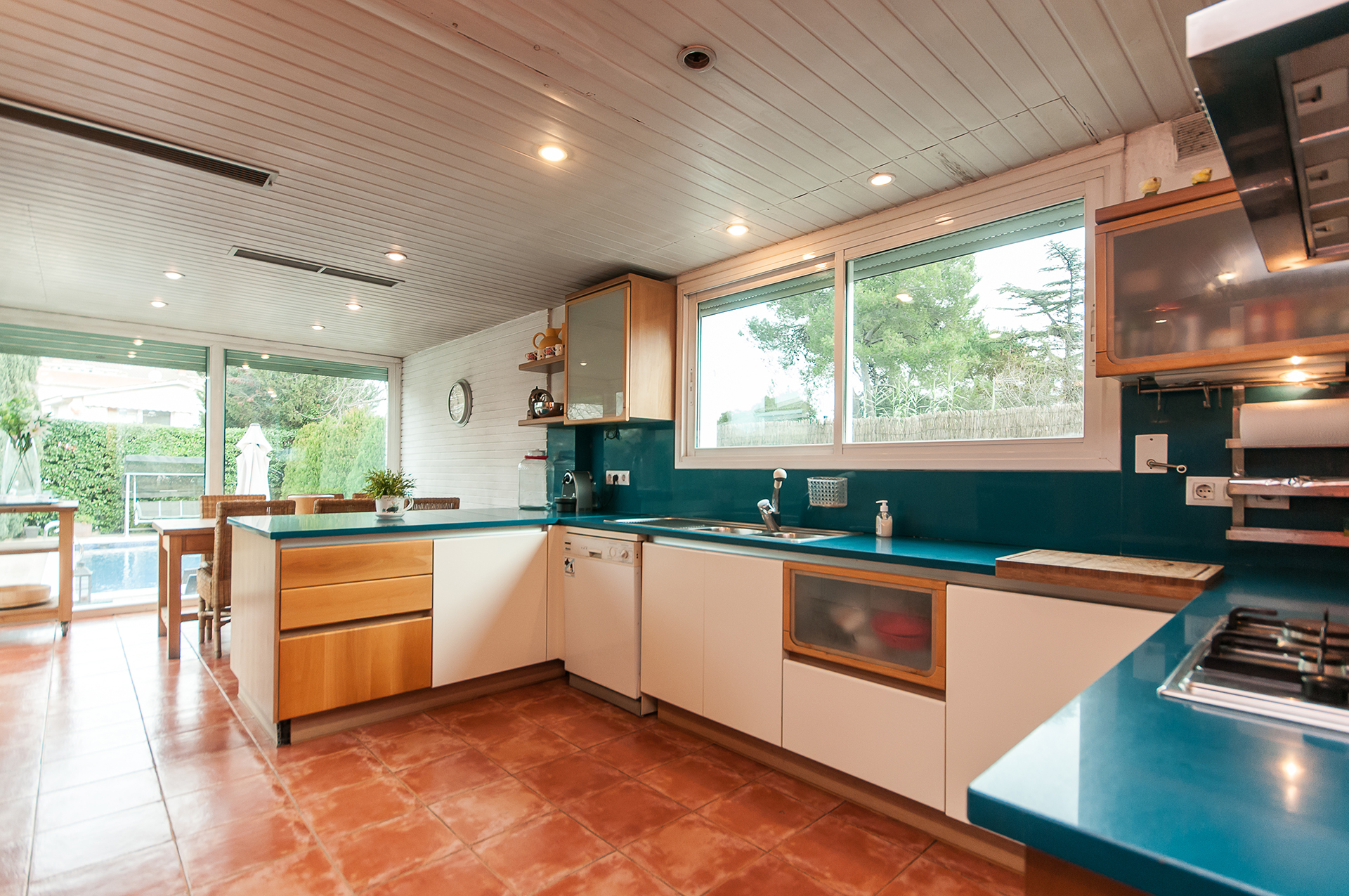 Una cuina singular on les hi hagi, amb un marbre de color únic. Aquest espai és diàfan, ampli, amb àrea office generosa i plena de llum gràcies als finestrals i la porta de vidre que dóna accés al jardí de 800 m2 que envolta tota la casa, que gaudeix d’una distribució molt funcional. La situació de la propietat és immillorable, en una àrea residencial envoltada de parcs i jardins i a 6 minuts caminant dels FFGC. Gaudeix d´una distribució molt funcional; espais amplis i diàfans, molt lluminosa. A l´exterior la casa disposa de 2 porxos amb accés directe al jardí de 800 m2 que envolta tota la casa.