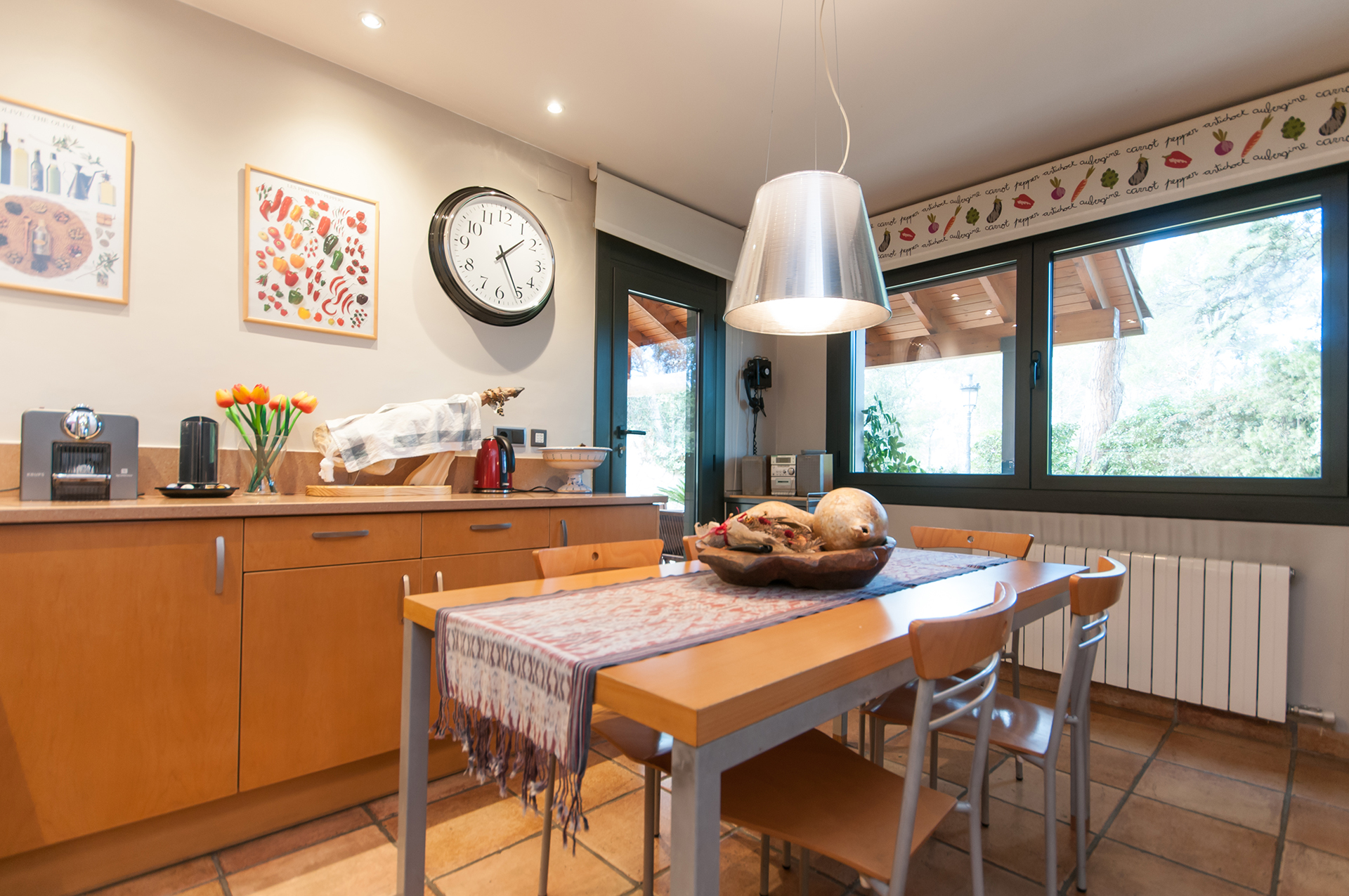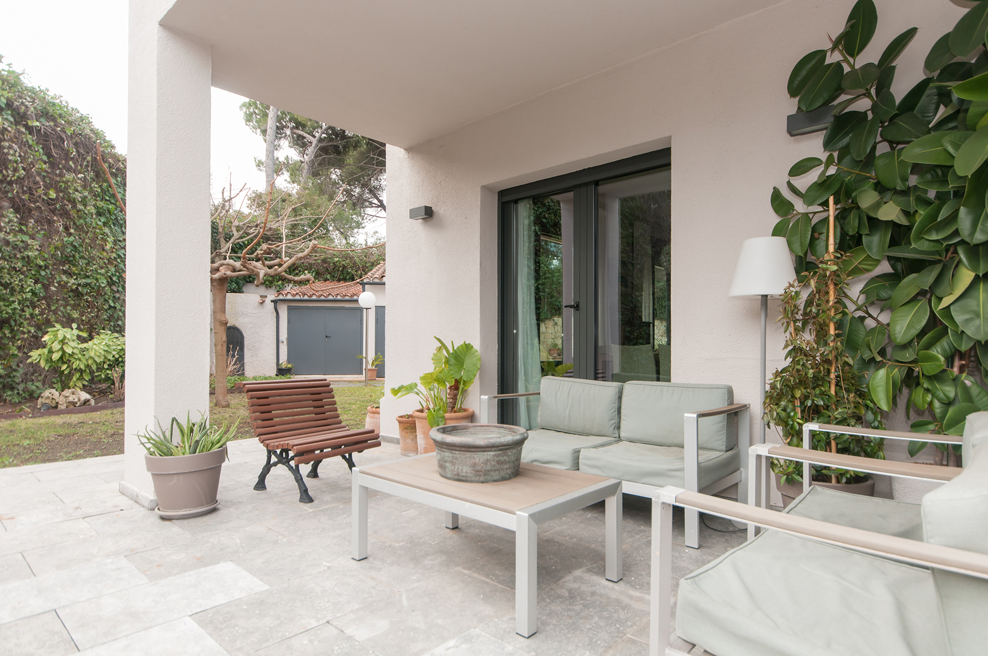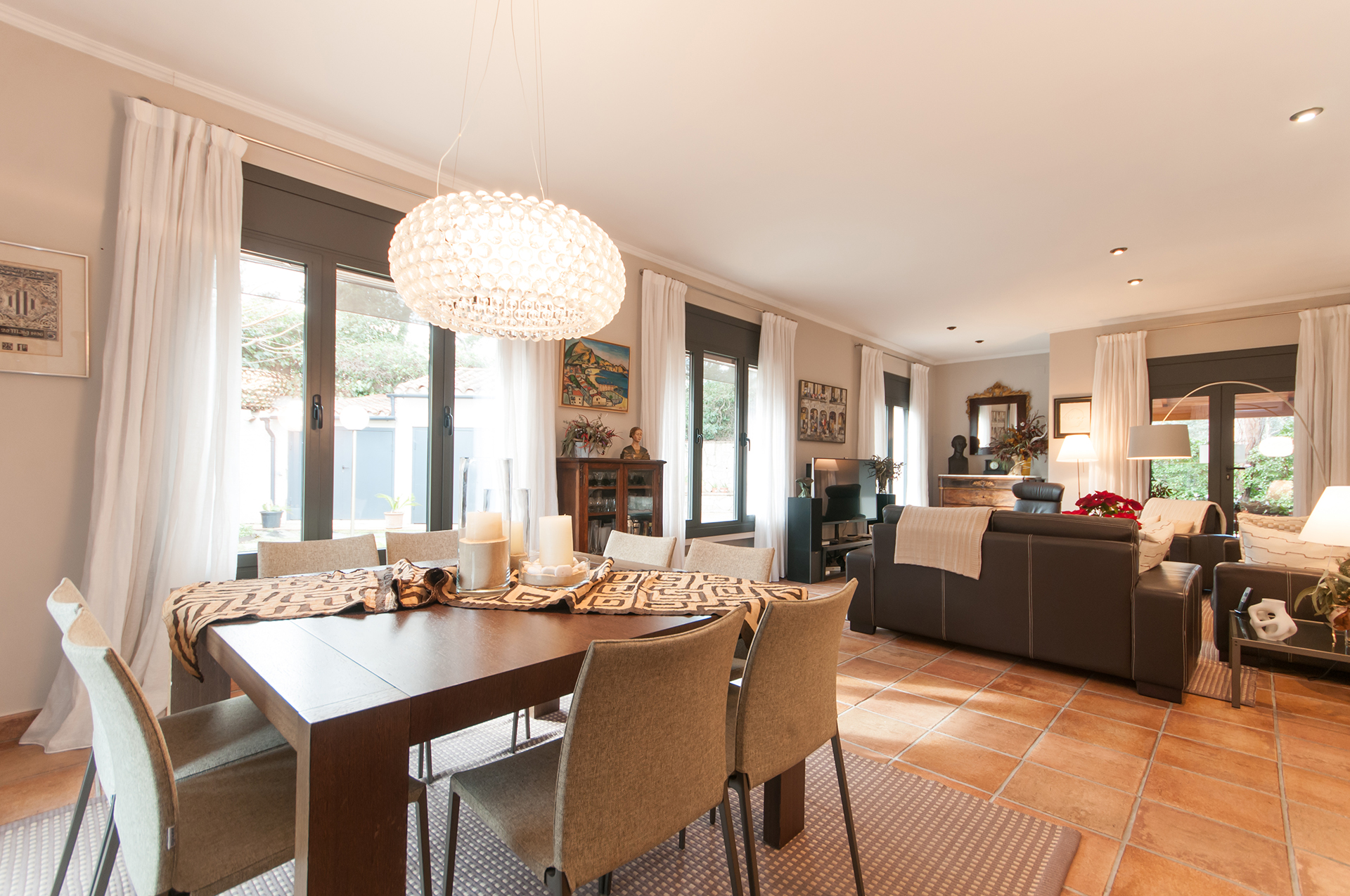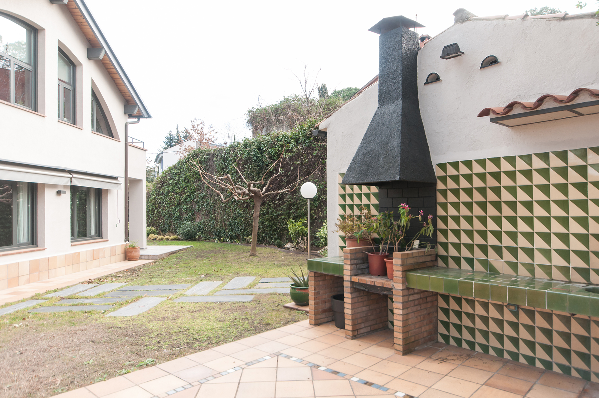A la planta baixa trobem rebedor, gran sala d’estar – menjador de 44 m2 amb accés al jardí, cuina office de 24 m2 amb zona de rebost independent i accés directe al porxo i gran jardí, amb instal·lació de reg automàtic per aspersors i degoteig, zona de barbacoa i dos porxos.