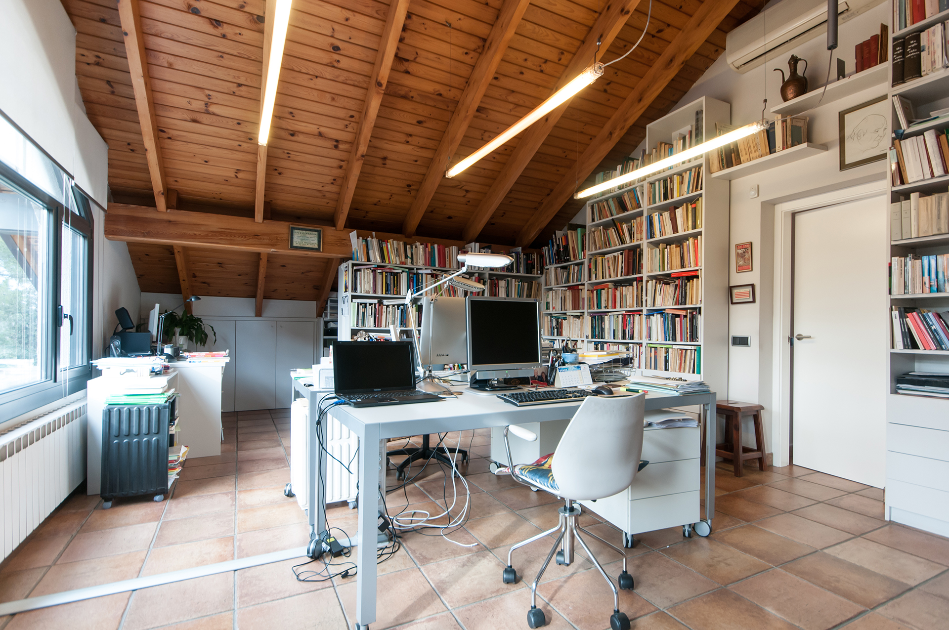 A la planta pis hi trobem 2 habitacions dobles, un estudi-despatx de 43 m2 amb grans finestrals i sostres sota teulada de fusta, un bany complet, un lavabo i una àmplia terrassa.